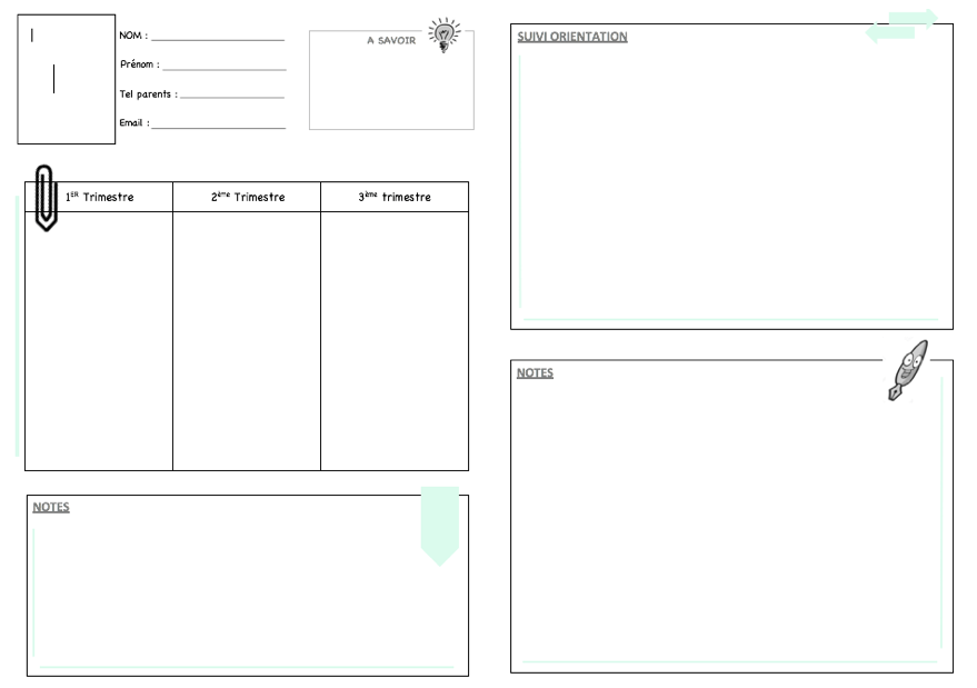 PARTIE 2 – LE SUIVI ELEVES: 2 pages par élève avec les 3 trimestres, le suivi de l’orientation et des notes pour les divers échanges avec l’élève.